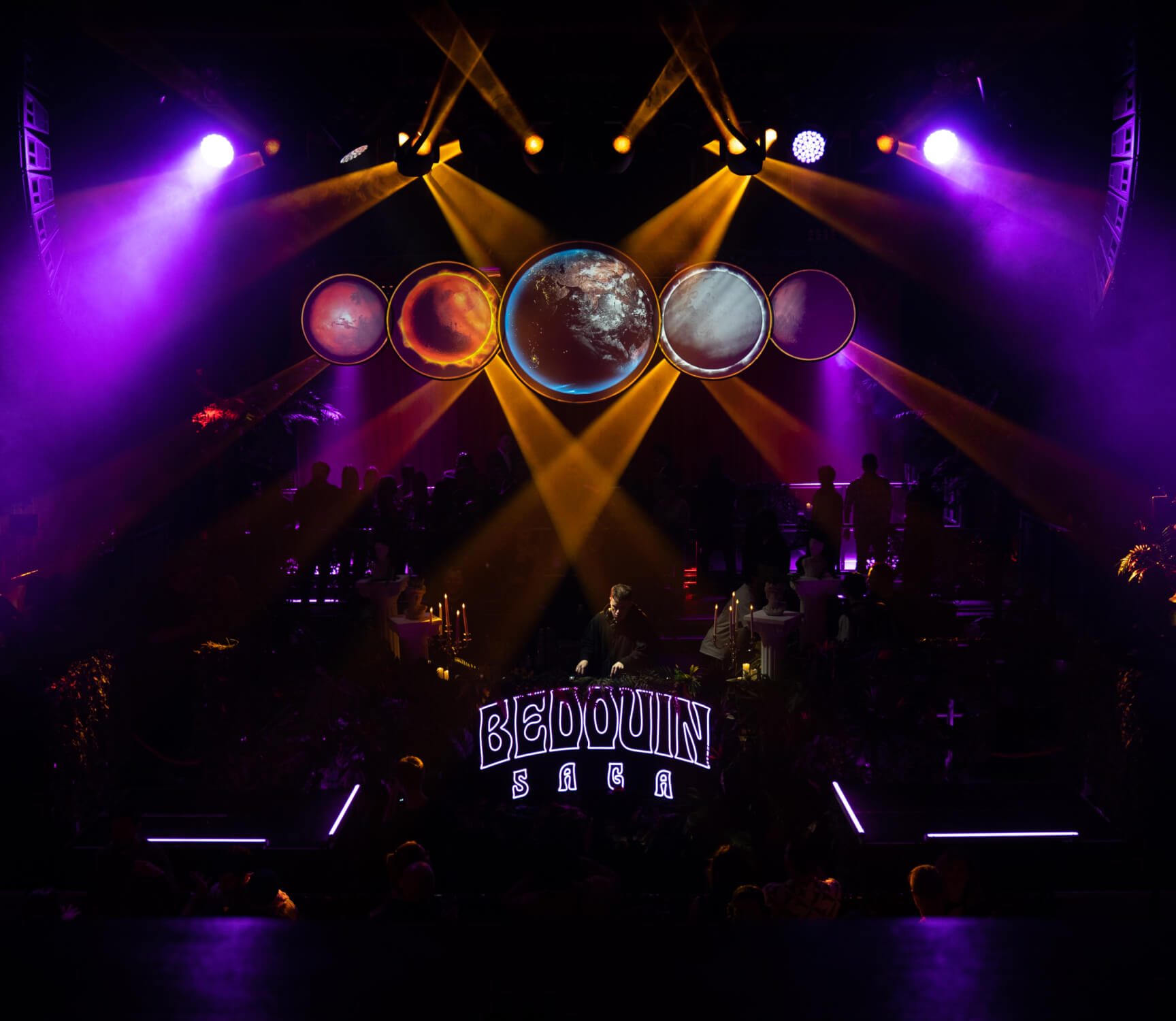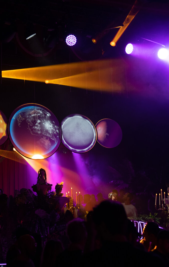 The process commenced with conceiving and developing circular screens and a bespoke rigging structure, accompanied by rigorous testing to ensure a seamless event setup. Simultaneously, we crafted a visual pack of planets, subsequently projected onto the circular screens.